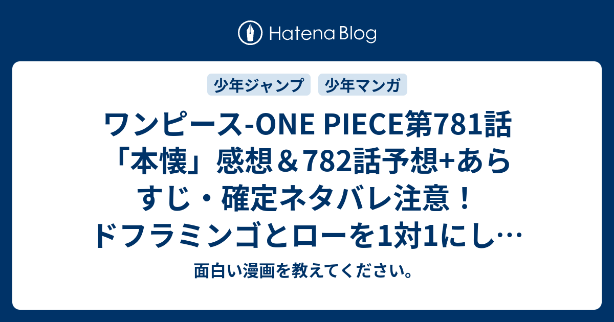 ワンピース One Piece第781話 本懐 感想 7話予想 あらすじ 確定ネタバレ注意 ドフラミンゴとローを1対1にして見守ったルフィは 週刊少年ジャンプ感想18号15年 Wj 面白い漫画を教えてください